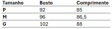 Tabela de medidas:
