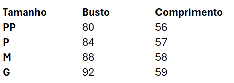 Tabela de Medidas: